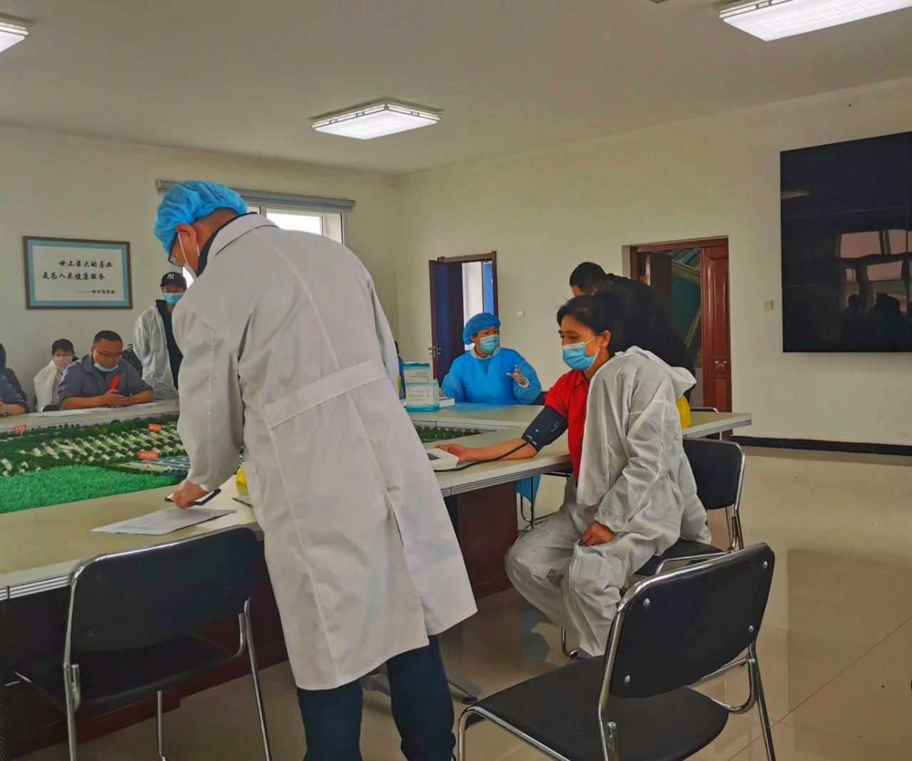 医生细心地为大家测量血压,提醒注射疫苗的注意事项。